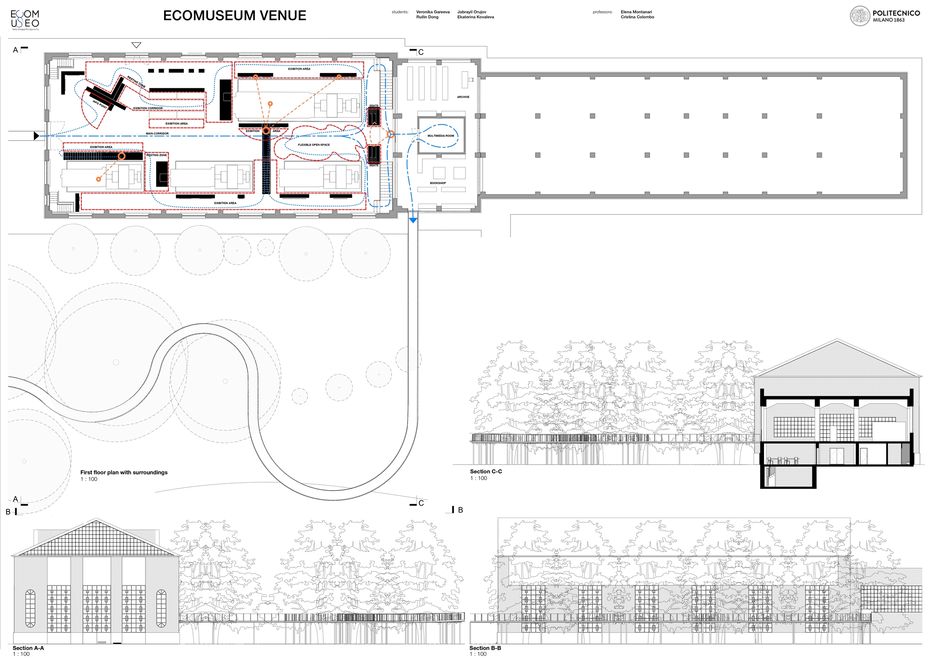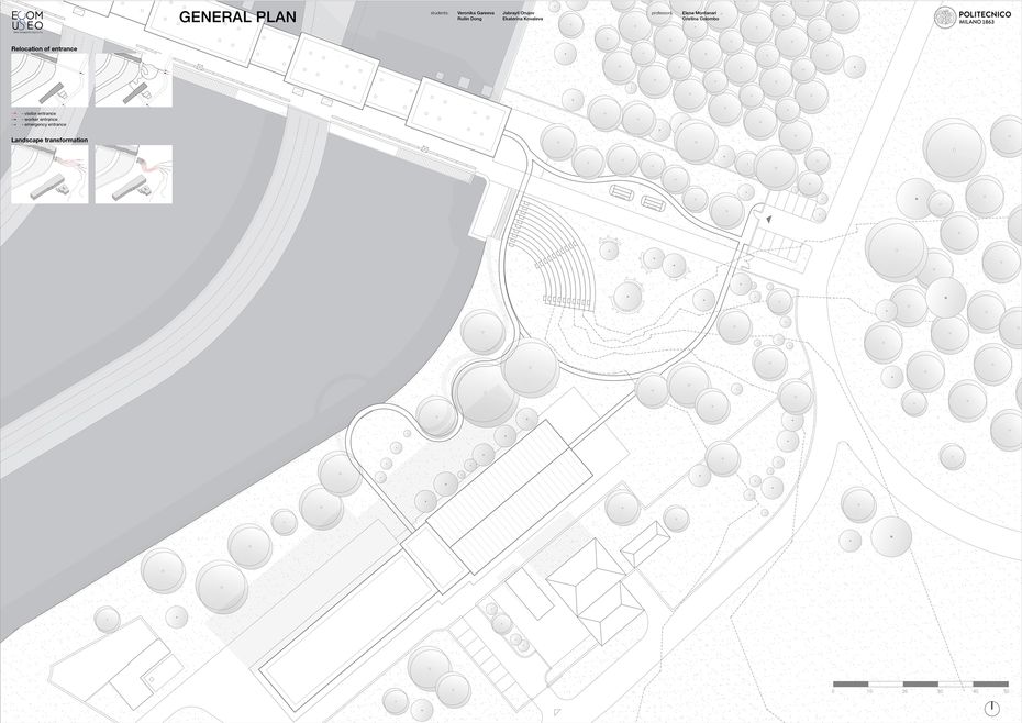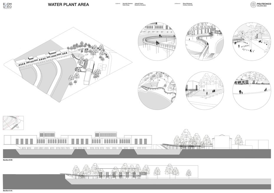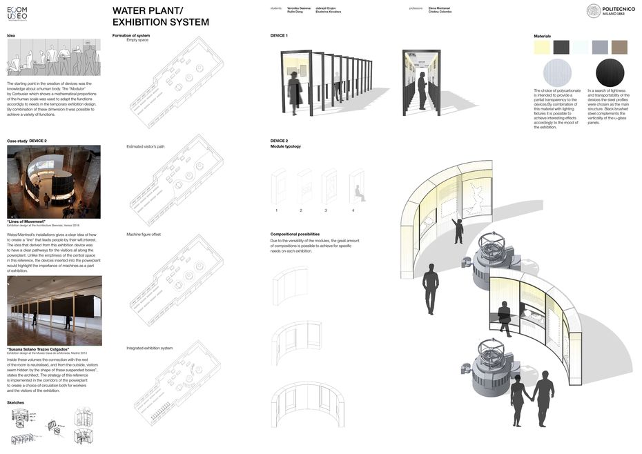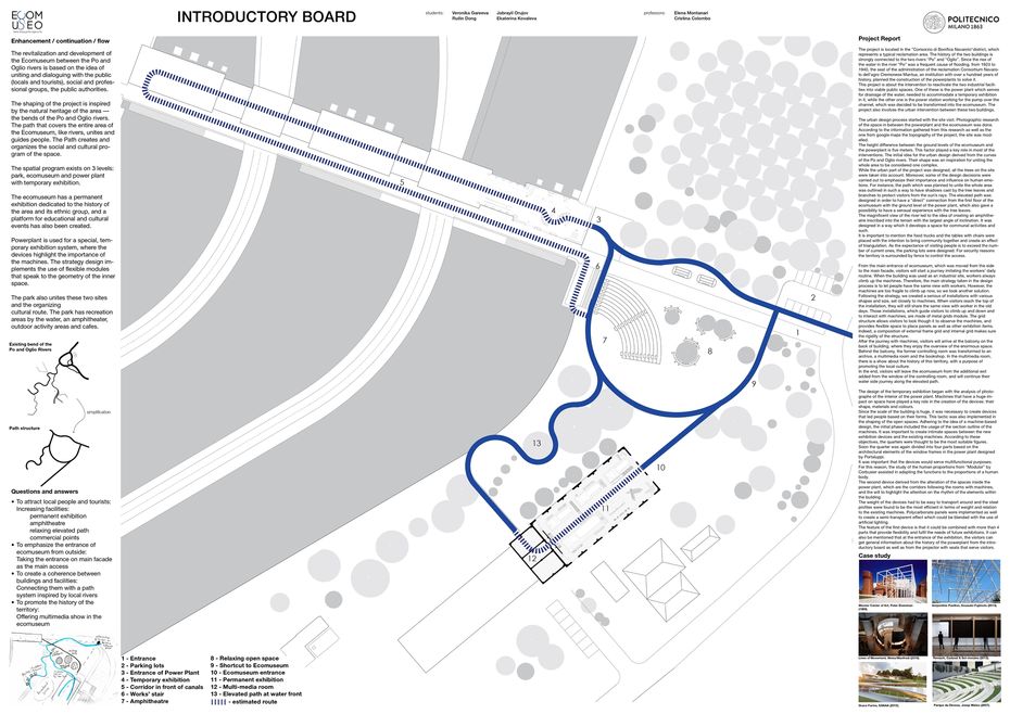 Проектировали мы в реальном пространстве, ездили на север Италии, под город Мантуя. Нам рассказывали про рабочую территорию, проводили экскурсию. Это была территория действующей ГЭС, дамба со шлюзами для ключевых водных артерий Северной Италии. Сооружение архитектора Пьеро Порталуппи, модерн, даже наверное, эклектика, архитектура XIX–XX веков. На территории уже существует экомузей. Основной задачей стало обновление концепции, создание на территории полноценного экомузея с общественным пространством, постоянной и временной выставочных экспозиций. Мы работали в интернациональной команде из четырех человек, вели проект вместе. В итоге для реализации мы выбрали метафору, которую придумала я, и уже дальше развивали ее каждый по своей сфере. Получился достаточно глобальный и не самый простой в реализации, но красивый проект.