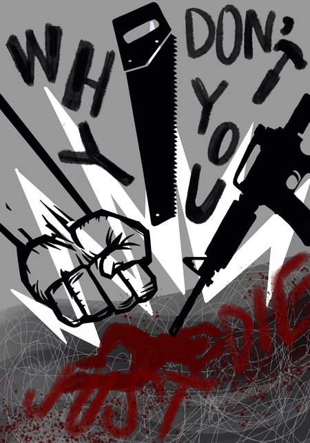 An illustrated poster depicting the main character in the middle who will eventually try to be killed by his girlfriend’s family, a saw, a gun and a fist become a sign of things that will kill him.
