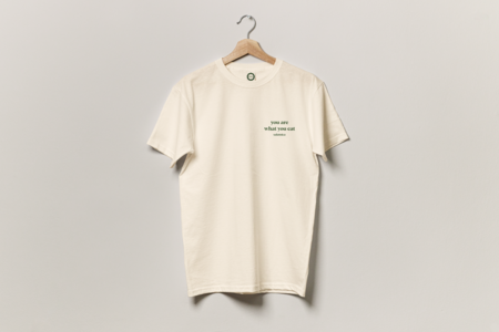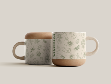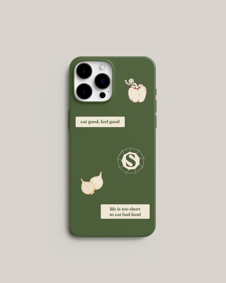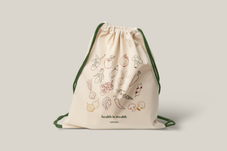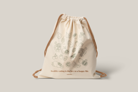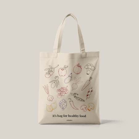 Для разработки мерча были взяты за основу логотип и фирменные цвета бренда: зеленый, оранжевый и бежевый. Чтобы разработать минималистичный и подходящий под стиль заведения мерч, были использованы рисованные овощи и фрукты, которые отсылают нас к основным продаваемым продуктам- салат и смузи. Кроме этого присутствует коммуникация в виде фраз про правильное и сбалансированное питание.