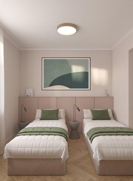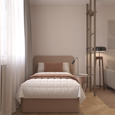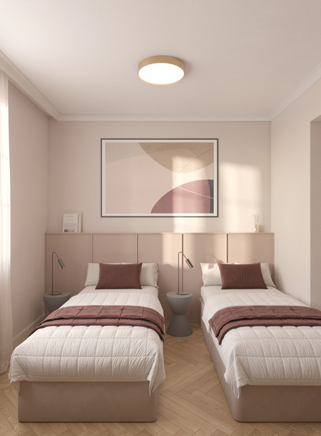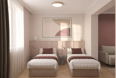 В проекте использовалось большое количество материалов, особое внимание уделялось текстилю и его оттенкам. В каждом номере присутствовали свои акцентные оттенки, но должен был читаться общий стиль. Также было важно выстроить связь между цветовыми решениями мебели, текстиля и отделочными материалами. Например, можем посмотреть на материал кровати — это персиковый велюр, ниже представлена древовидная схема создания этого материала. Материал создавался с использованием карт: Corona Color Correction, Mix, Composite и конечно же Falloff.