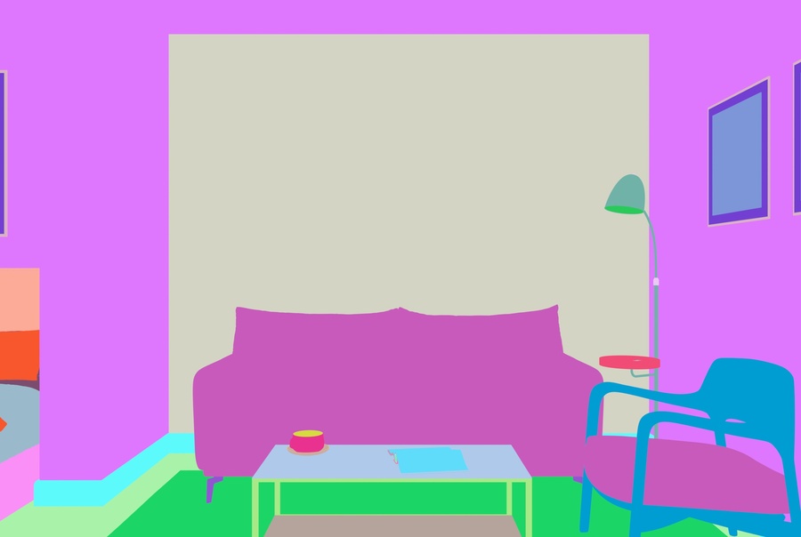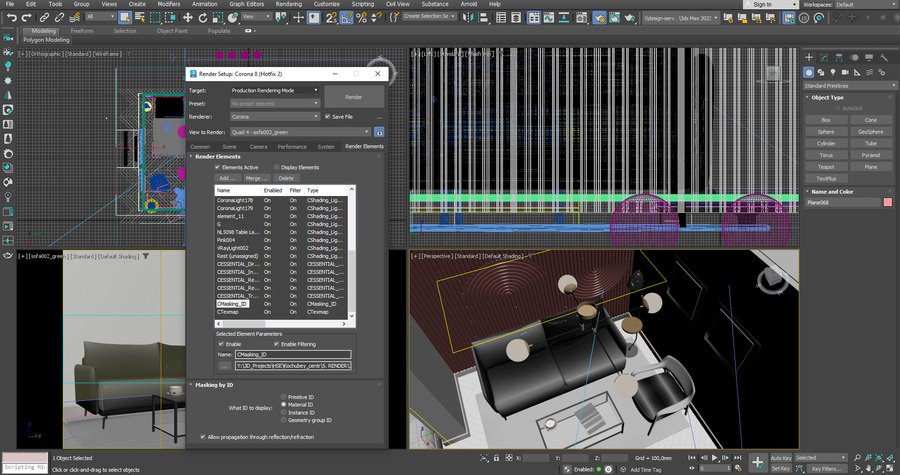 Сложность данного проекта заключалась в большом количестве альтернативных вариантов отделки и материалов. Для решения этой проблемы программой предусмотрено несколько вариантов, например, у Batch рендера есть Scene state, он помогает легко управлять видимостью объектов. Также у пользователя есть возможность изменять любые оттенки, используя рендер-элемент CMasking_ID. На слайдах ниже приведен пример элемента CMasking_ID, он выделяет цветом объекты с определенным материалом, далее работа с этой маской проходит в Photoshop.