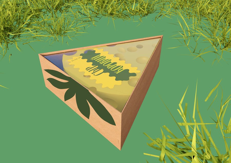 Запрос в GPT: напиши на английском промпт для создания упаковки сыра. На упаковке должны быть иллюстрации с растениями. В упаковке должны быть прозрачные вставки, через которые видно сыр внутри