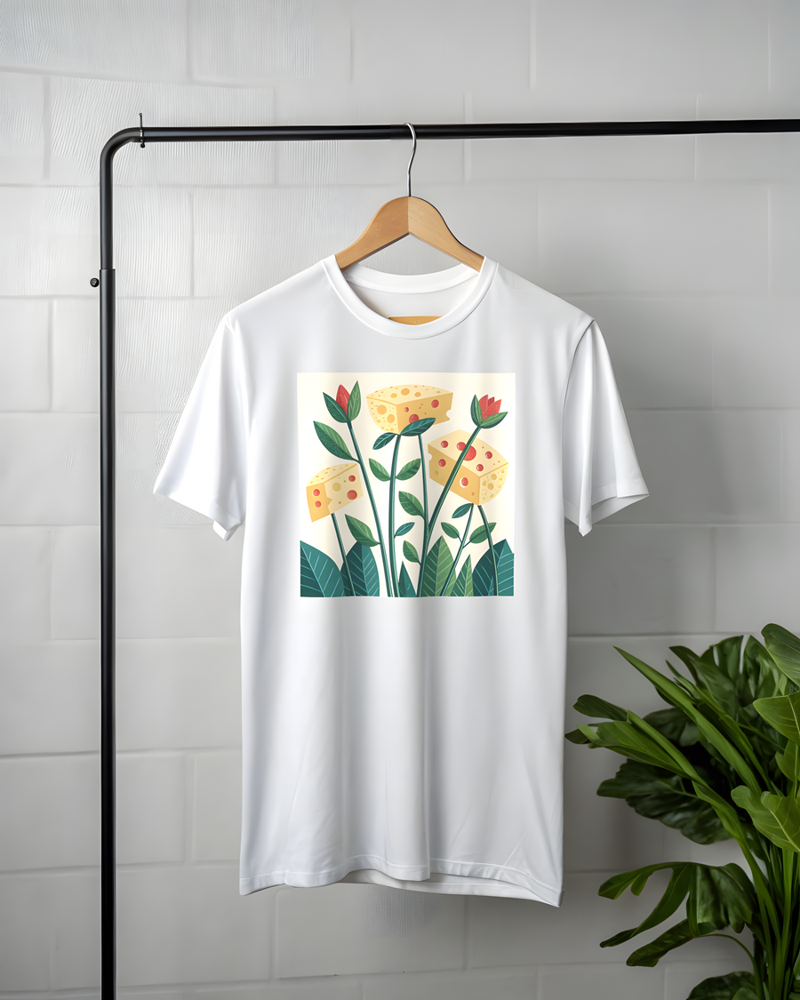 Мокапы и изображения созданы в Recraft Промпты футболок: white t-shirt / beige t-shirt hanging on a branch of a tree Промпт: Create an imaginative illustration featuring pieces of cheese growing on tall stems, resembling flower buds. The cheese should be surrounded by vibrant green leaves, giving the appearance of a whimsical garden.
