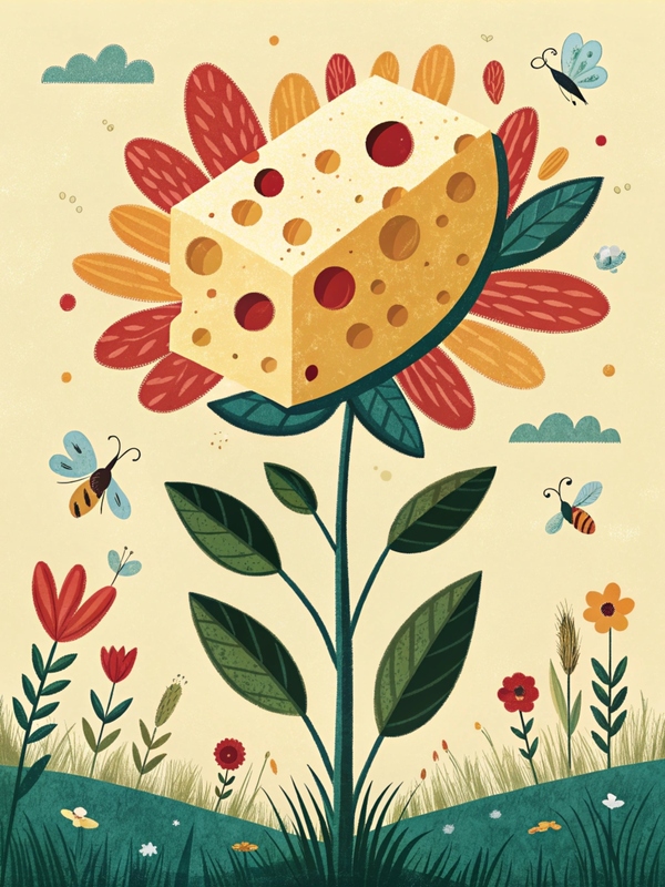Промпт в Recraft: Create a vibrant poster featuring a whimsical design of cheese that resembles a flower growing in a field. The cheese flower should have a sturdy stem and green leaves, giving it a playful and surreal appearance. Surround the cheese flower with a colorful meadow, adding details like grass, small butterflies, and a bright blue sky to enhance the cheerful atmosphere. Use bright colors to make the cheese flower stand out and evoke a sense of joy and creativity. Use beige tones, dark green, olive green, orange, yellow and red. The background should be beige.