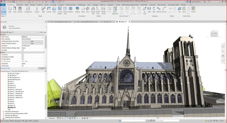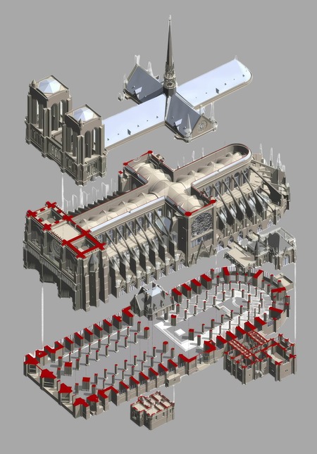 В работе архитекторы применяли 3Д-сканирование, однако, интересным фактом является то, что здание было отсканировано еще до пожара. Это позволило построить сверхточную модель собора, отследить состояния конструкций и спланировать реставрационные работы. Можно рассмотреть и с какой точностью удалось смоделировать каждый узор и орнамент. BIM-модель оптимизировала вопрос проектирования в короткие сроки.
