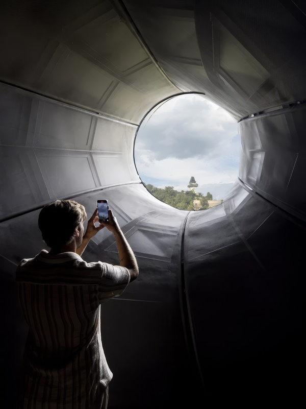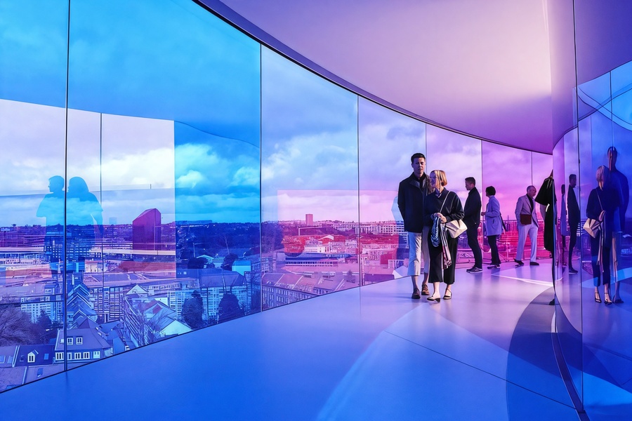 Сначала всю конструкцию построили в компьютере, это удобно, так как можно было экспериментировать с формой и цветами. Последнее особенно важно, так как смотря на панораму под разным углом, прохожие наблюдали совершенно разный город. Цветовые стекла разработаны таким образом, что даже самые активные солнечные лучи не нагревают посетителей.