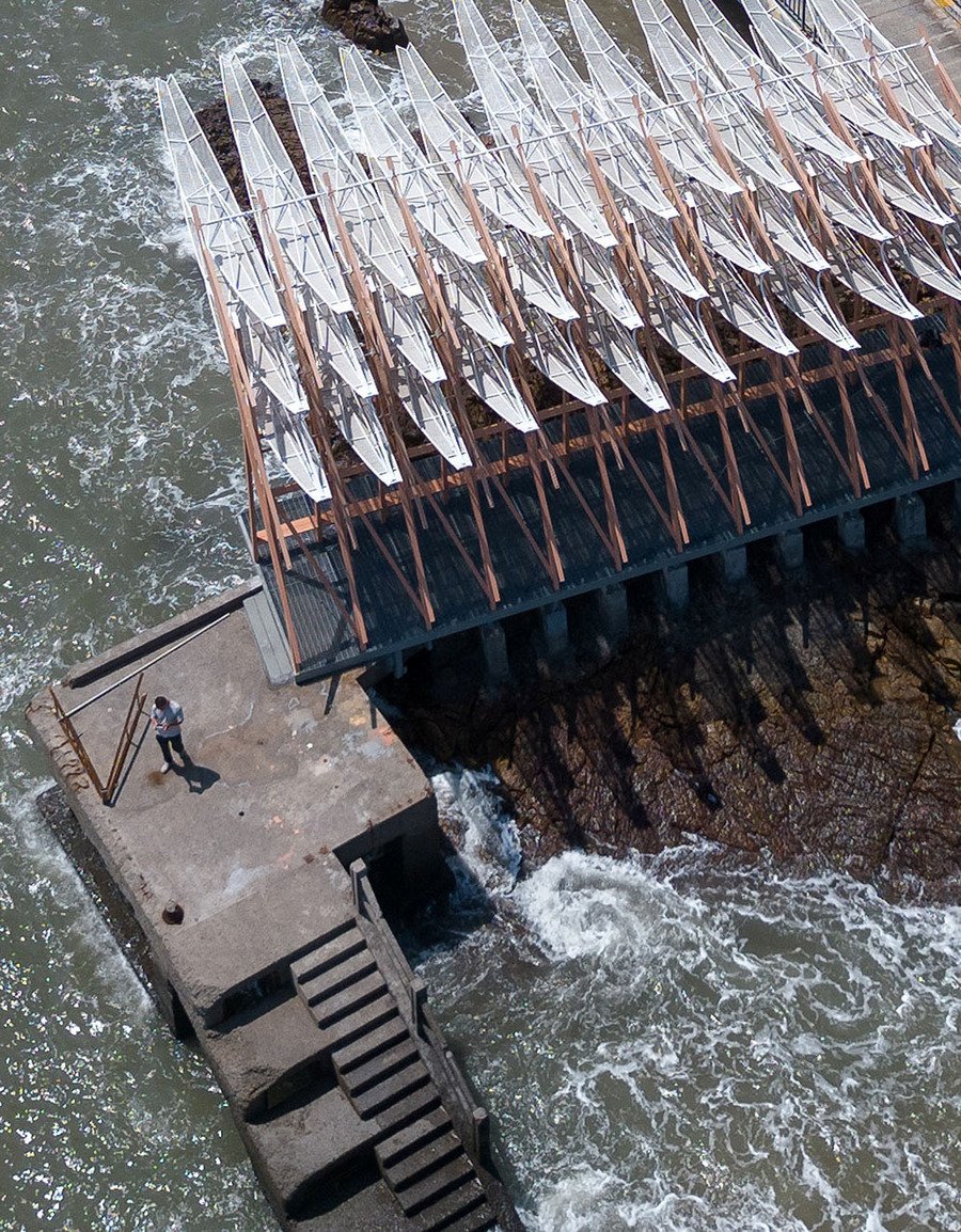 На острове Чайшань расположен Coastal Long Pavilion, созданный на месте руин каменной постройки, которая защищала побережье от волн. Главной целью является достопримечательность и общественное пространство, сохраняющее память острова. Одним из главных материалов является бетон, армированный бамбуком, а прозрачная крыша позволяет обеспечить естественное освещение и единство с окружающей средой. На этапе проектирования было использовано 3D-моделирование.