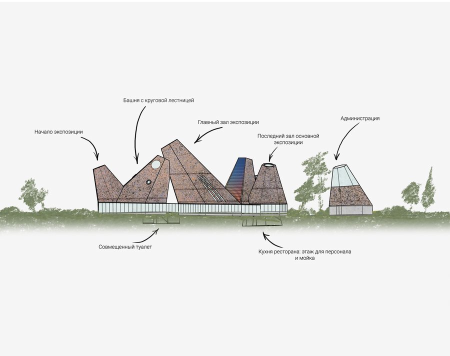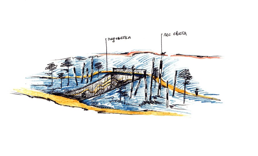 Веранда — тихое место в парке, где можно насладиться видами на реку, подкрепиться, позагорать и просто отдохнуть. Данная архитектурная форма спроектирована мной так, словно она разрезается на две части проходящим через нее солнечным лучом (пешеходной дорожкой). Косая форма крыши и угловатость задают ритм постройке и выделяют ее на фоне гладкого спокойного ландшафта.