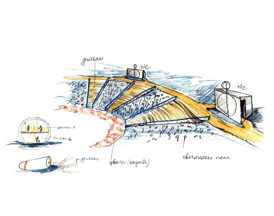 С амфитеатра начинается зона «вечера», в которой все мероприятия рассчитаны на более поздние часы суток. Здесь удобно проводить кинопоказы, мастер-классы, лекции и открытые микрофоны. Пол амфитеатра украшен разноцветной мозаикой, иллюстрирующей солнечную систему.