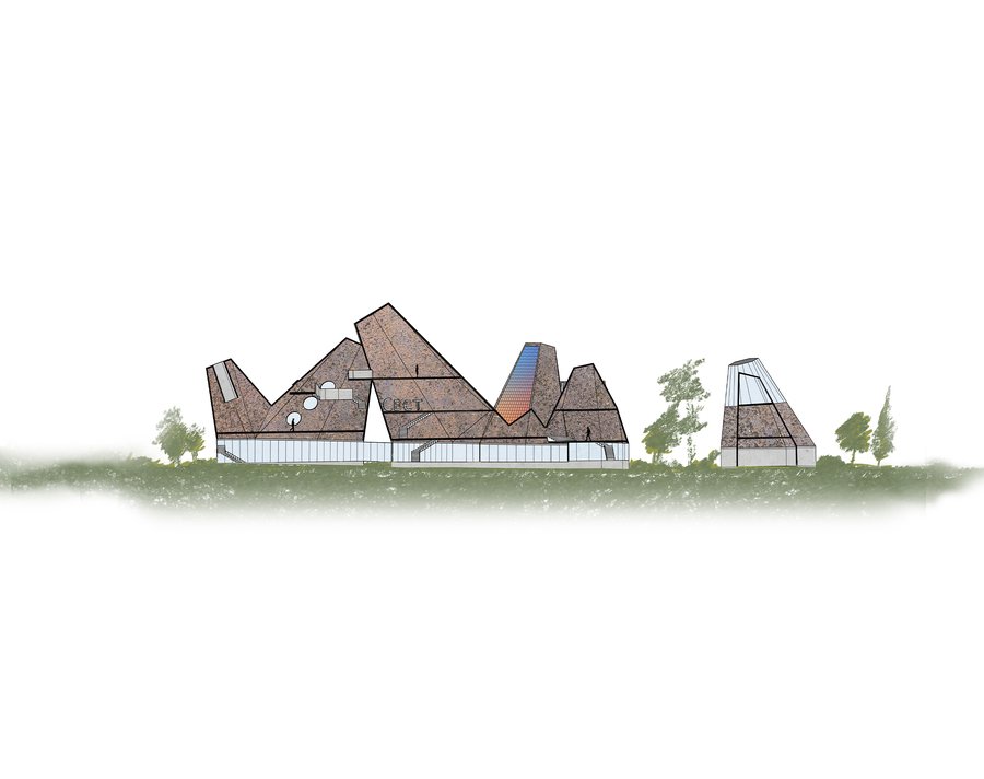 В качестве материалов фасада были использованы медные листы с и бетон. Оба материала нарочито состарены, словно они выгорели на солнце и вынесли множество природных катаклизмов. Также, металлическая часть фасада выигрышно бликует на солнце, приманивая, будто оазис в пустыне, посетителей из разных уголков парка, находящегося ниже по склону.