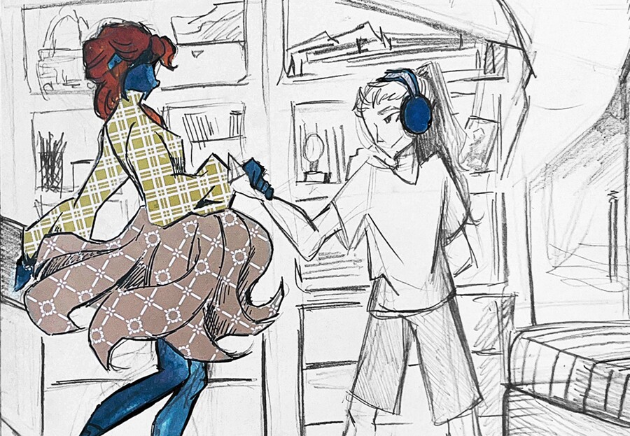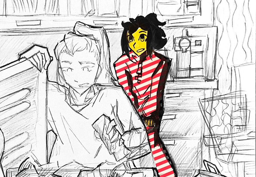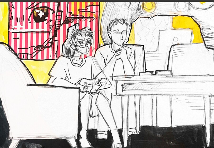 I capture reality with a precise line of a pencil and thoughts with vibrant colors of the colored inks to demonstrate how it is to constantly think about your stories using myself as an example: