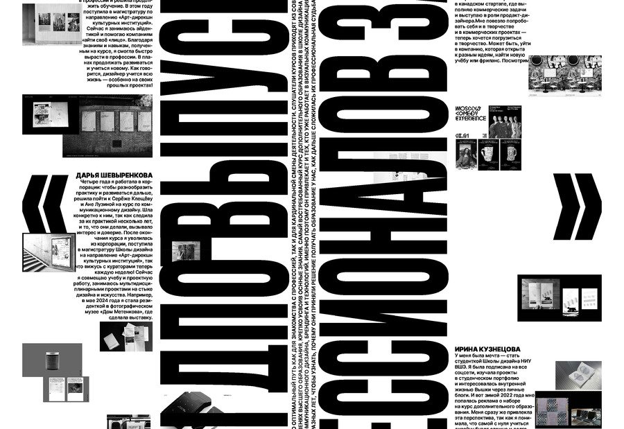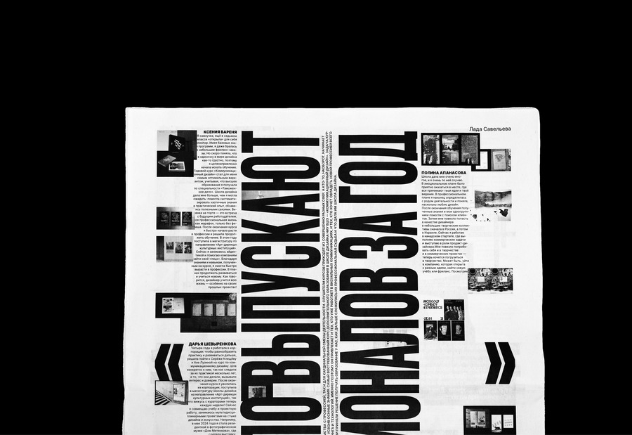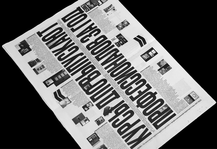 Комплекс типографических клаузур: портрет, натюрморт, пейзаж, выполненных в техниках аппликации и цифрового коллажа. Экспериментальный леттеринг. Дизайн газетных полос формата 420×578 мм по текстам новостей Школы дизайна.