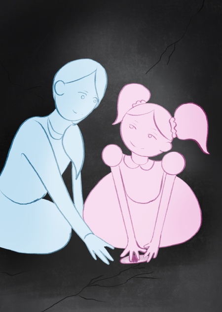 Две маленькие девочки пытаются починить разваливающийся дом с помощью бантиков и пластырей.
