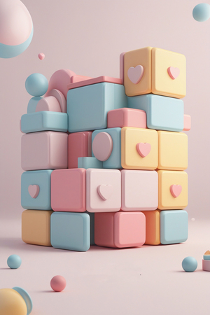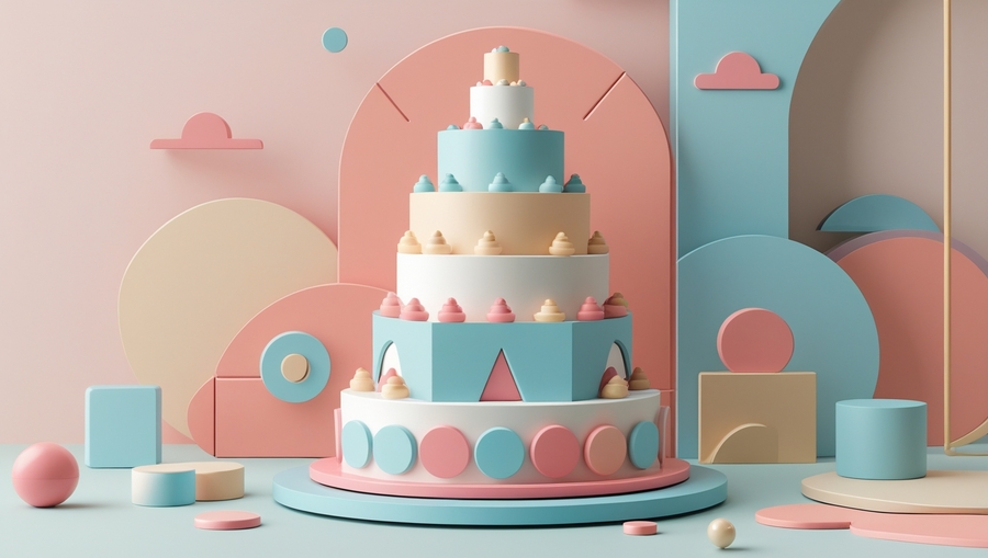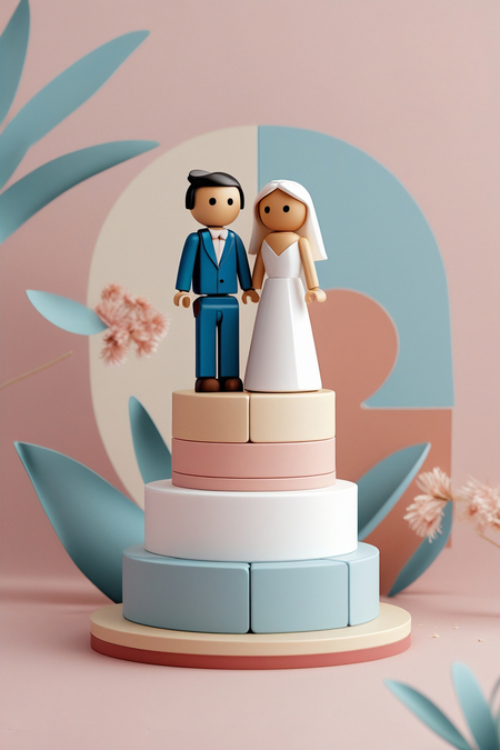 Prompt: Create a delightful key-visual 2D illustration. The background features soft pastel tones like blush pink, beige, and light blue. The wedding cake is assembling from a children’s construction kit. The overall design is clean, modern, and elegant. Design elements inspired by a children’s construction kit, with playful modular shapes and soft rounded edges.