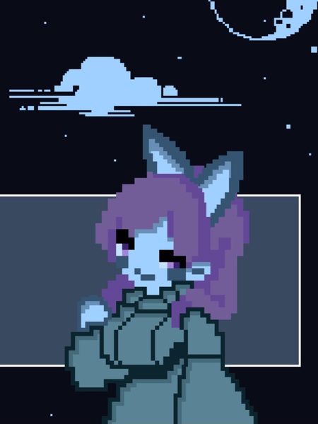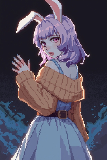 2. pixel art portrait of a female fantasy game character, waist-up, shoulder-length light purple hair, blue skin, violet eyes, with rabbit ears. she wears a pastel blue dress with a warm sweater-like collar and a dark belt. she stands half-turned, waving with her far hand, looking at the viewer. background color is black amber with soft blue clouds. detailed pixel lighting, soft warm highlights, consistent style with dark fantasy pixel portrait.