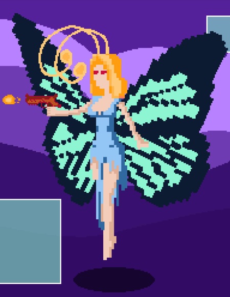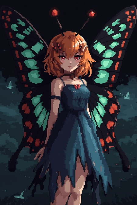 2. pixel portrait of a game character, a girl with large black and mint butterfly wings, red eyes, orange hair down to her shoulders, with orange butterfly antennae sticking out, a blue dress that is torn at the bottom, detailed pixel graphics style, impressive lighting, black amber background with soft blue clouds, subtle shadows for depth, mysterious and eerie atmosphere, clear pixel outlines, high contrast, full-length.