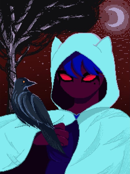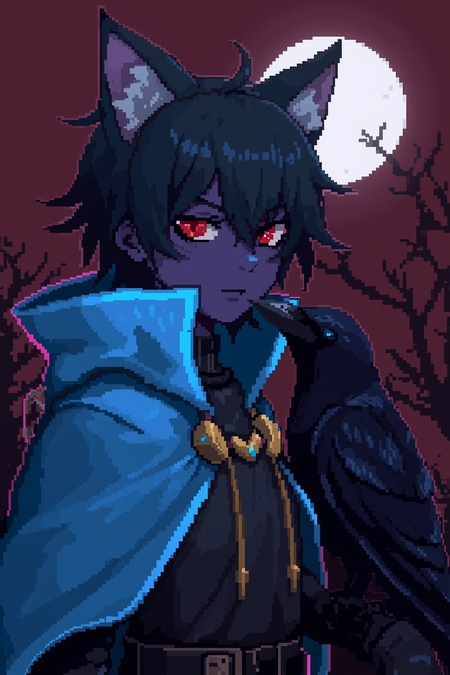 1. pixel portrait of a game character with waist-length skin color dark purple, eyes color neon red with black outline and smudges, hair color is dark blue. He has no mouth. He is wearing a neon blue cape with cat ears on hood, and a raven is sitting on his arm. The background color is dark red, and there is a cold shade bright moon and a tree in the background.