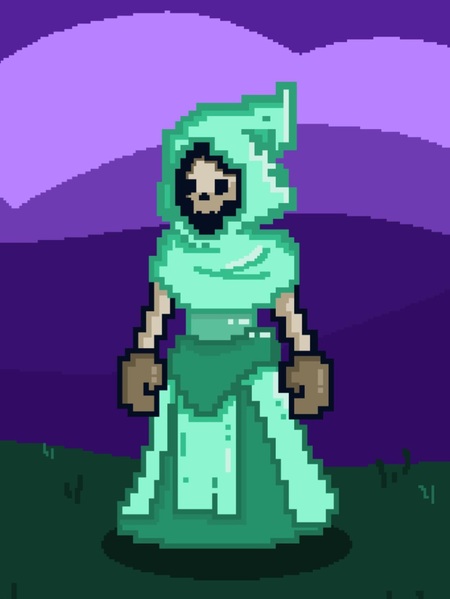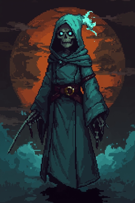 1. pixel art of a game character, a skeleton wearing a long mint-colored robe with a death-like hood with a belt, no visible mouth or nose, glowing cyan eyes with a faint mist effect, detailed pixel art style, dramatic lighting, background color is black amber with soft blue clouds, subtle shadows for depth, mysterious and eerie atmosphere, dark fantasy game character, sharp pixel outlines, high contrast, In full growth.