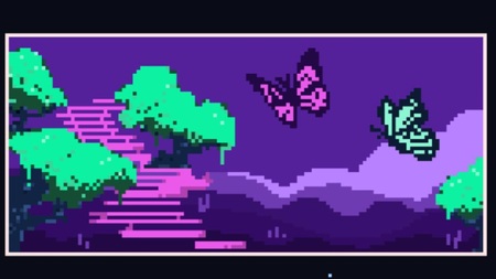 1. pixelated location, purple 3D clouds in the background, pink steps in the middle ground surrounded by trees with bright lime-green foliage, butterflies in the foreground, lime-green and pink, a mysterious and eerie atmosphere, clear pixelated outlines, and high contrast