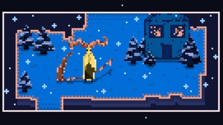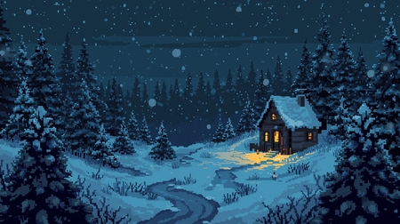 2. pixelated location, winter night, snow falling, snowdrifts, Christmas trees in the snow, a small village house with a light in the window, a mysterious and eerie atmosphere, clear pixelated outlines, and high contrast
