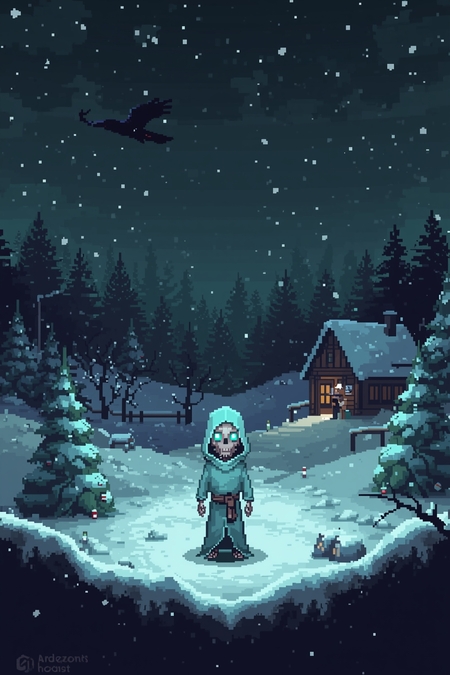 1. A poster: pixelated location, winter night, snow falling, snowdrifts, Christmas trees in the snow, a small village house with a light in the window, a mysterious and eerie atmosphere, clear pixelated outlines, and high contrast. A raven flies in the sky. In the middle, a full-length character: a pixel skeleton wearing a mint-colored robe with a death-like hood, no visible mouth or nose, glowing cyan eyes with a faint mist effect, detailed pixel art style, dramatic lighting, background color is black amber with soft blue clouds, subtle shadows for depth, mysterious and eerie atmosphere, same artistic style and tone as a dark fantasy game character, sharp pixel outlines, high contrast, consistent with previous character design, In full growth.