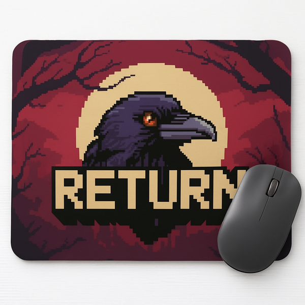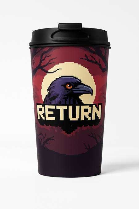 A metroidvania logo with realistic pixel art graphics called Return. The logo features a crow in the colors 1d182c and 425da0 with eyes in the color ca943d on a background in the color c94150. The background features a large moon in the color e5ddd9 and dark tree branches.