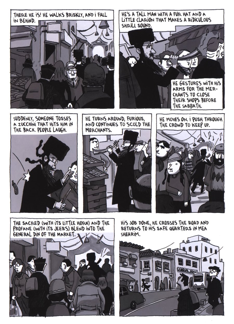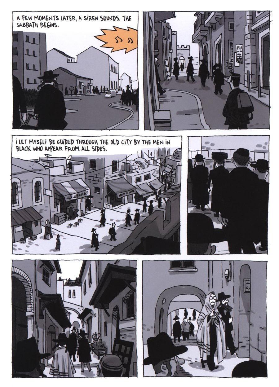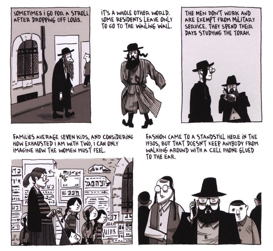Ги Делиль с осторожностью рассказывает об ортодоксальной еврейской общине и изображает жителей Меа Шеарима с акцентом на их культурные традиции и религиозные обряды, так как на них и строится жизнь в этом районе. Он подчеркивает их отличительную одежду, которая служит визуальными маркерами их веры и идентичности. Ортодоксальные евреи придерживаются строгих законов шаббата, которые запрещают выходить за пределы своего района. Ги Делиль с любопытством повествует об этом мире (хотя, очевидно, хочется сказать много нелестного): сочувствует женщине, которая явно сильно вымоталась от деторождения.
