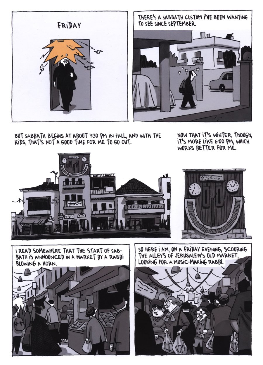 В ортодоксальных кварталах города, таких как Меа Шеарим, правила Шаббата соблюдаются очень строго. В одном из эпизодов комикса Делиль описывает, как его предупредили не заезжать на машине в ортодоксальный квартал в Шаббат, так как местные жители могут проявить агрессию в отношении тех, кто нарушает священный покой, но он все равно попал в эту ситуацию.