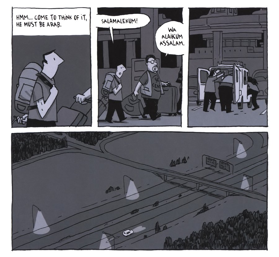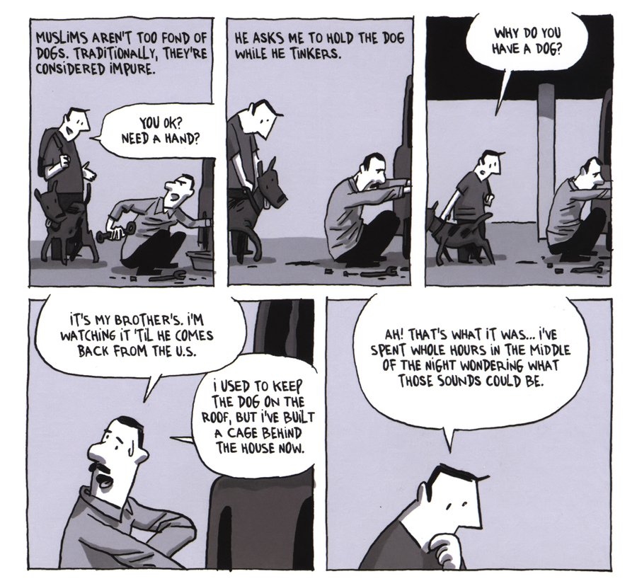 Автор встречается с мусульманкой на своем воркшопе — удивляется, зачем она пришла, раз в традициях ее религии нельзя рисовать людей и животных (аниконизм). И если изначально это выглядело комично, то дав контекст в виде ее жизненных трудностей (выдали замуж в 15, бросила школу, развелась и смогла вернуться в школу) и как труден был ее путь для возвращения на учебу, повествование побуждает сочувствовать ей и вообще всем женщинам в исламе. Он деликатно изображает этот эпизод. За культурными или религиозными барьерами скрываются индивидуальные истории и человеческие трудности, которые можно понять независимо от культурного контекста.