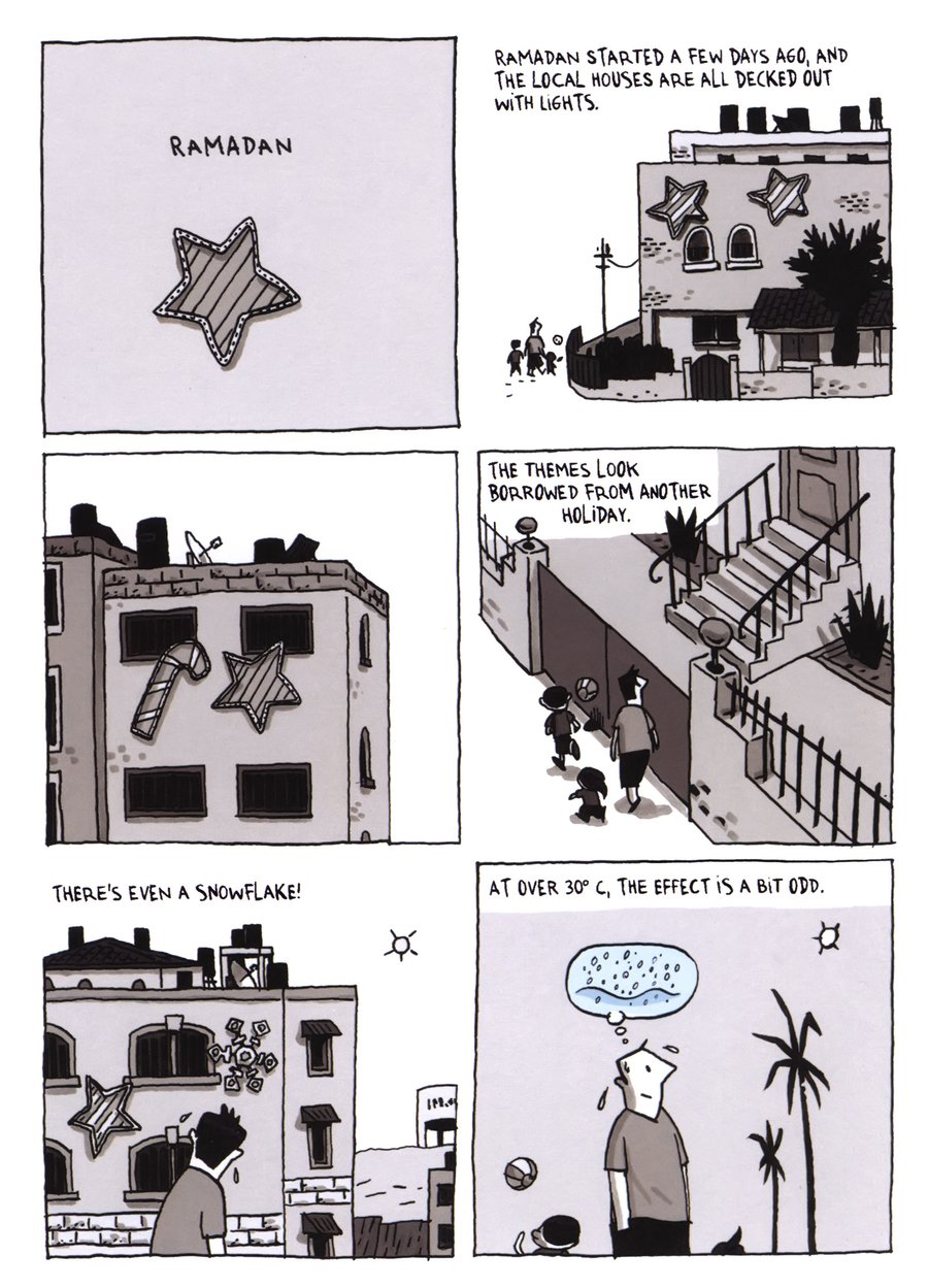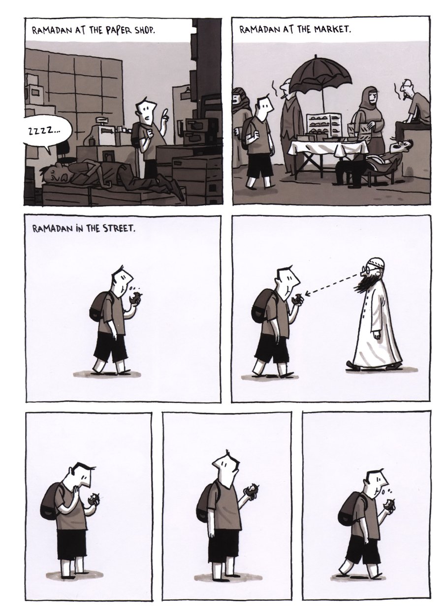 Прибыв незадолго до Рамадана, автору повезло немного познакомиться с этой культурой священного месяца для всех мусульман. Украшая дома не только традиционными образами, такими как праздничные фонари, звезды и полумесяц, но новогодними украшениями, что показывает как культуры соседствуют друг с другом и находятся в некотором родстве — традиции начинают спутываться и перенимать друг у друга элементы. Делиль, зная о распространенности Рамадана, не рассказывает о нем, как иногда случается с другими традициями, менее известными.