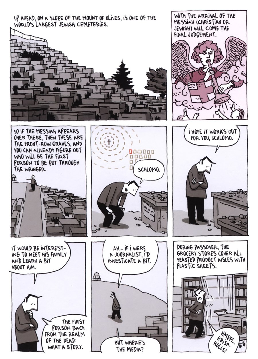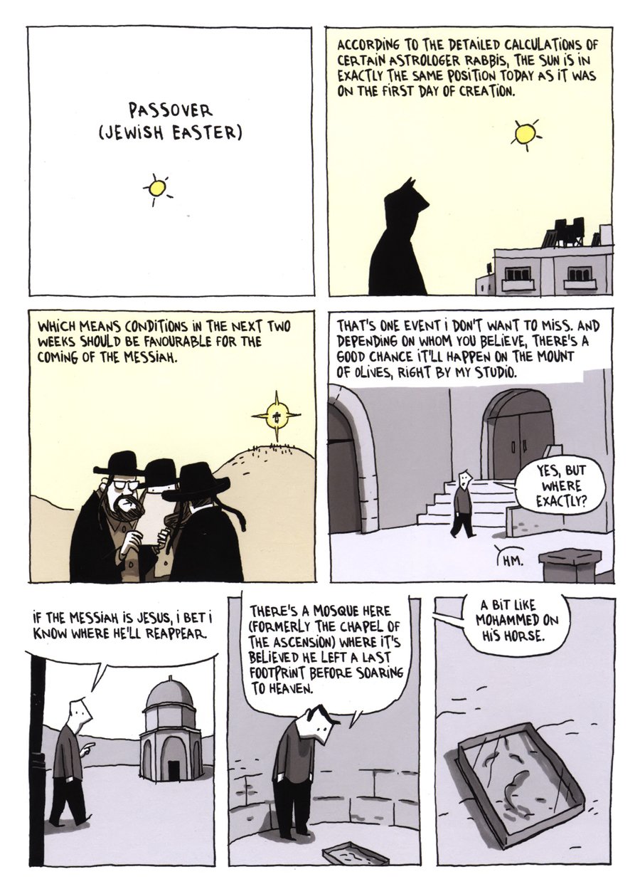 И совершенно по-иному он описывает христианство в Иерусалиме — редкими эпизодами, такими, как встреча со священником, который переоделся в мирскую одежду. Это знакомый автору (и читателям) мир, поэтому он не уделяет христианству значительное место в своем комиксе — на контрасте с удивительными традициями мусульман и евреев. Христианство в Иерусалиме для него — это нечто привычное, скорее часть повседневной культурной обстановки, чем объект особого внимания. И страницы, посвященные христианской культуре, к примеру, посещение церквей и кафе при них, добавляют эффект ностальгии и словно возвращают главного героя домой.