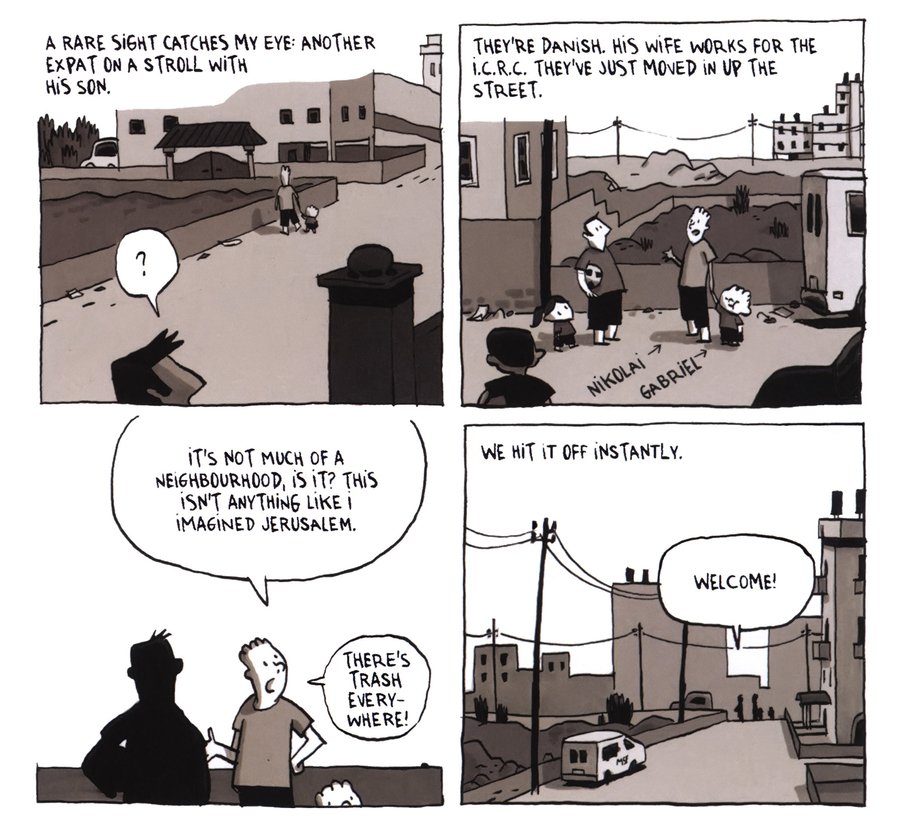 Иллюстрируя эти различия, но не проговаривая текстом, автор как бы подчеркивает, насколько эти различия влияют на повседневную жизнь. Чистые улицы и общественные пространства (современные детские площадки, кафе и магазины) в Западном Иерусалиме создают атмосферу нормальности и комфорта, резко контрастируя с условиями, с которыми сталкиваются жители Восточного Иерусалима. Он часто со своей семьей выбирается в современный район, чтобы как будто вернуться домой в Канаду, где все эти блага доступны, и на некоторое время забыть о запустении своего нового временного дома, и даже сближается с Николаем, другим эмигрантом, благодаря разговорам об инфраструктуре Иерусалима, который также, как и Делиль, находится в культурном шоке от этой разницы.