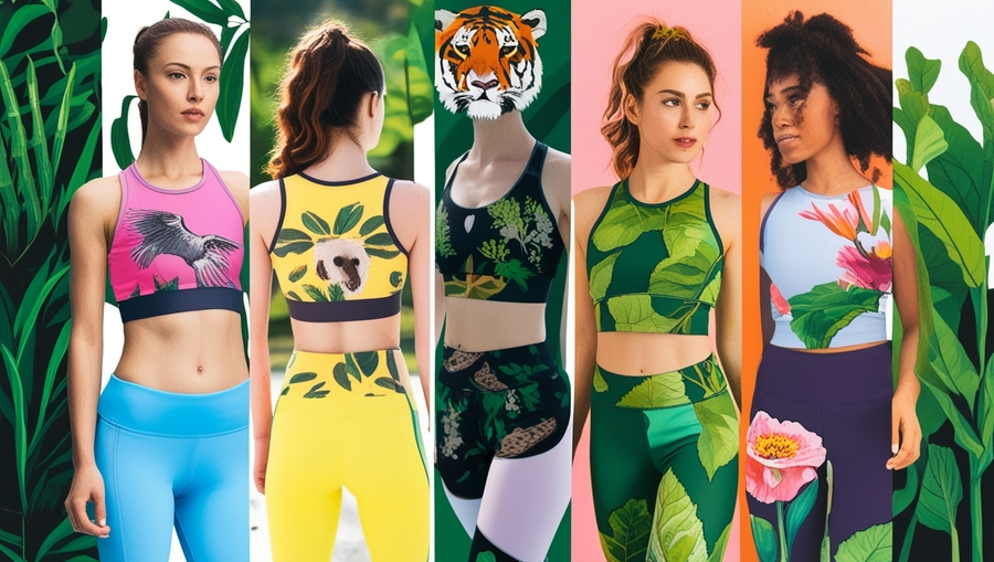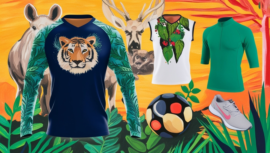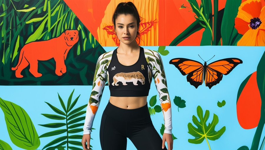 Промт: sportswear with prints of wildlife, prints of plants. В качестве референса стиля выступают оригинальные иллюстрации.