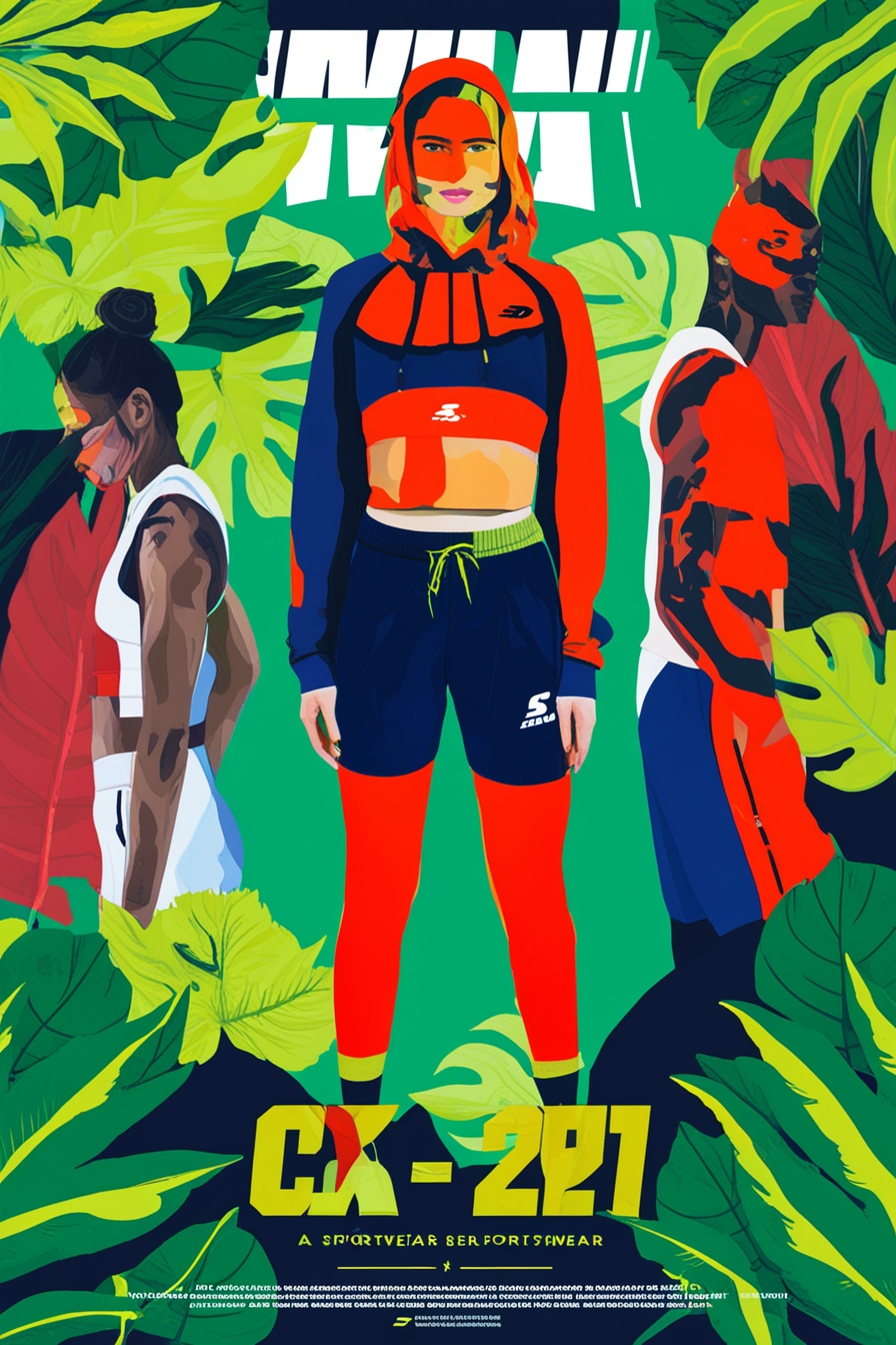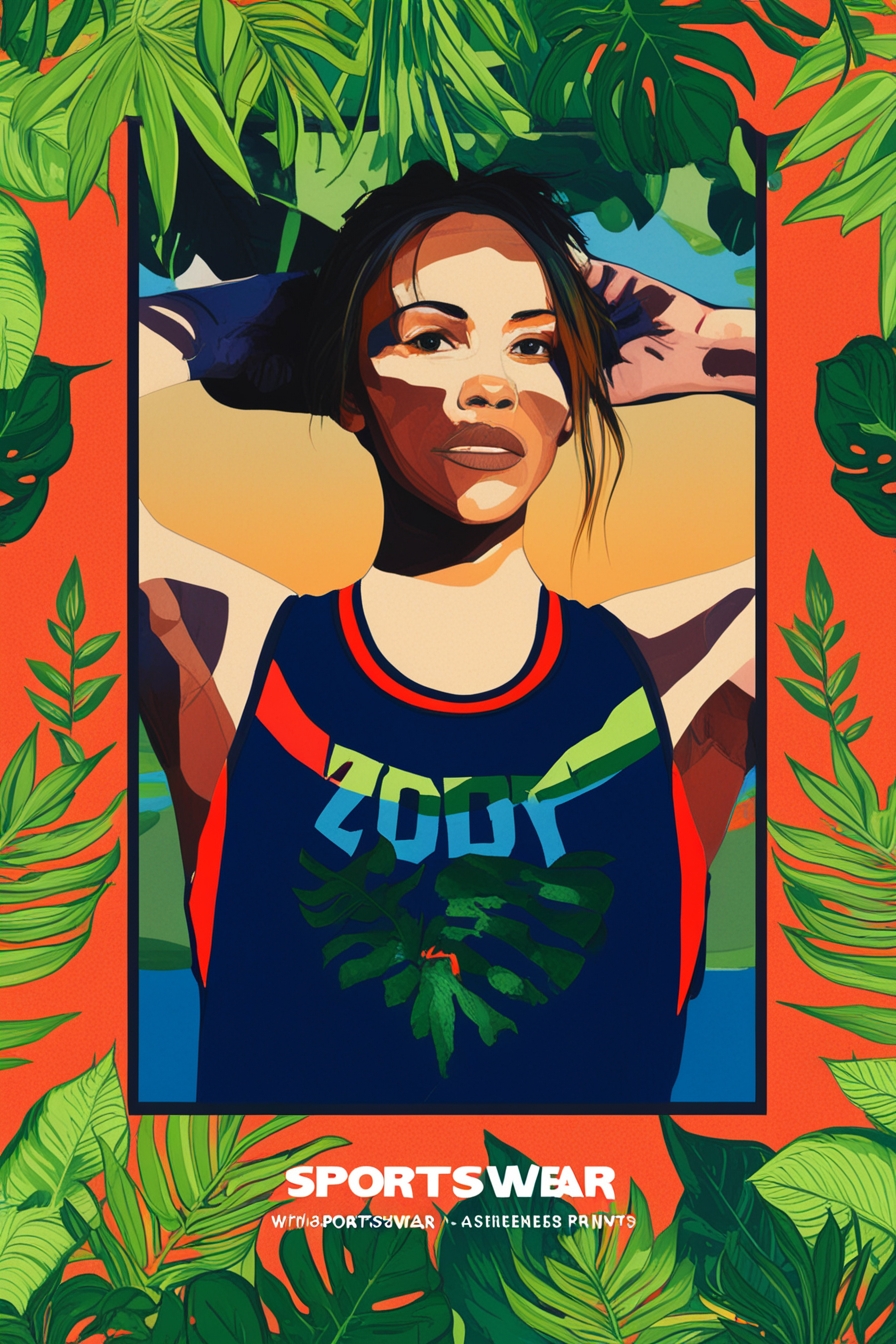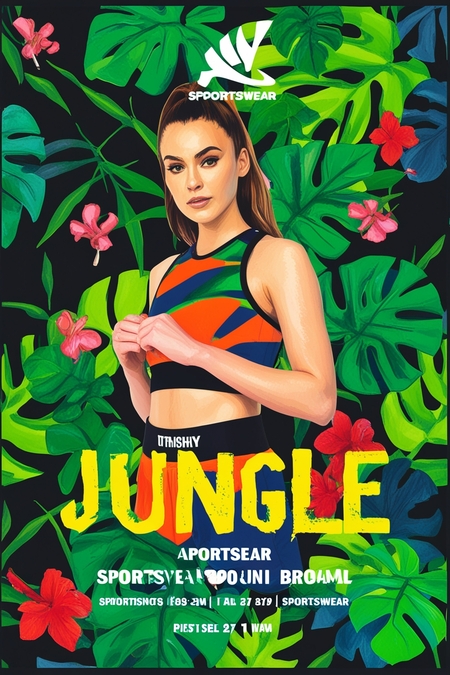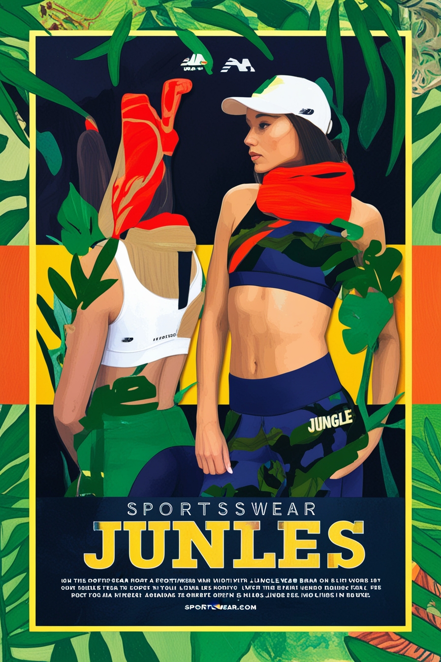 Промт: a poster for a sportswear brand with jungle prints. В качестве референса стиля выступают оригинальные иллюстрации.
