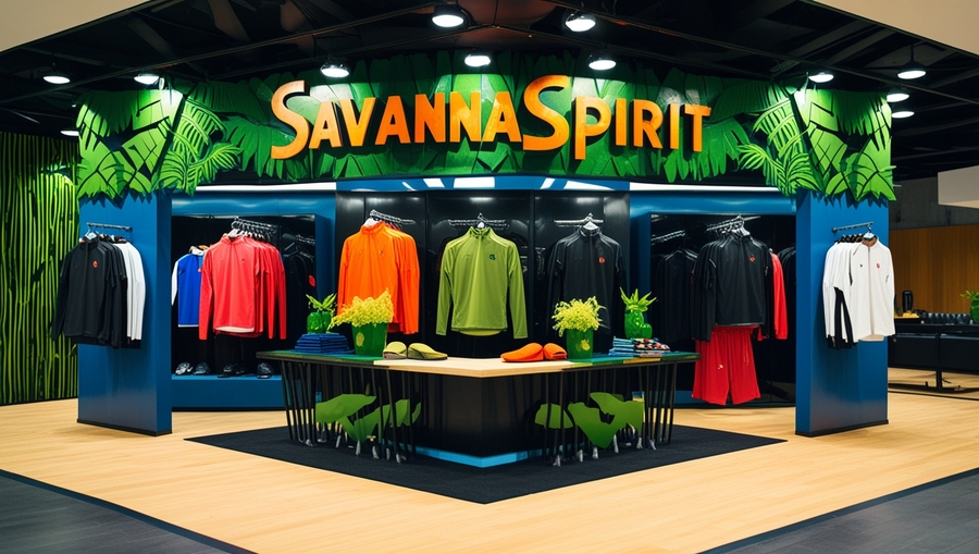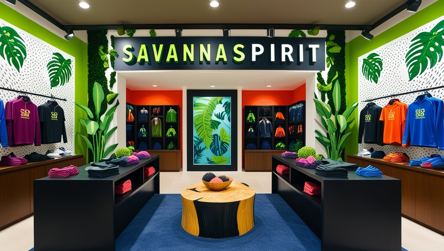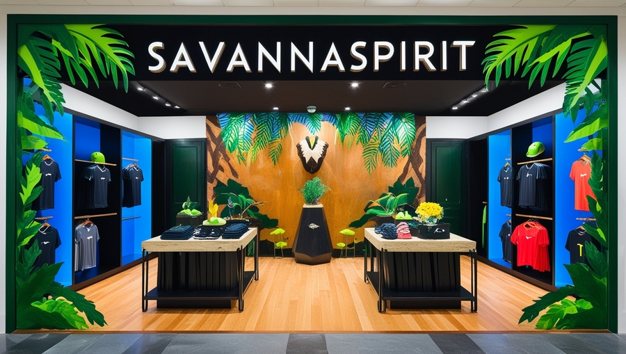 Промт: make a black sportswear shop called «SavannaSpirit» with jungle decor. В качестве референса стиля выступают оригинальные иллюстрации