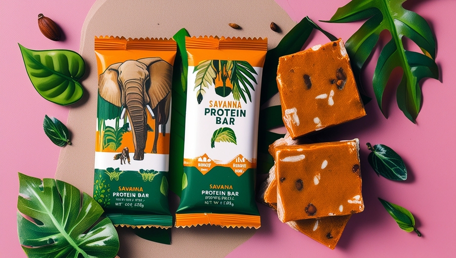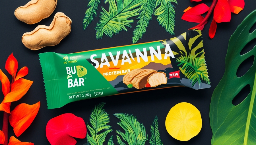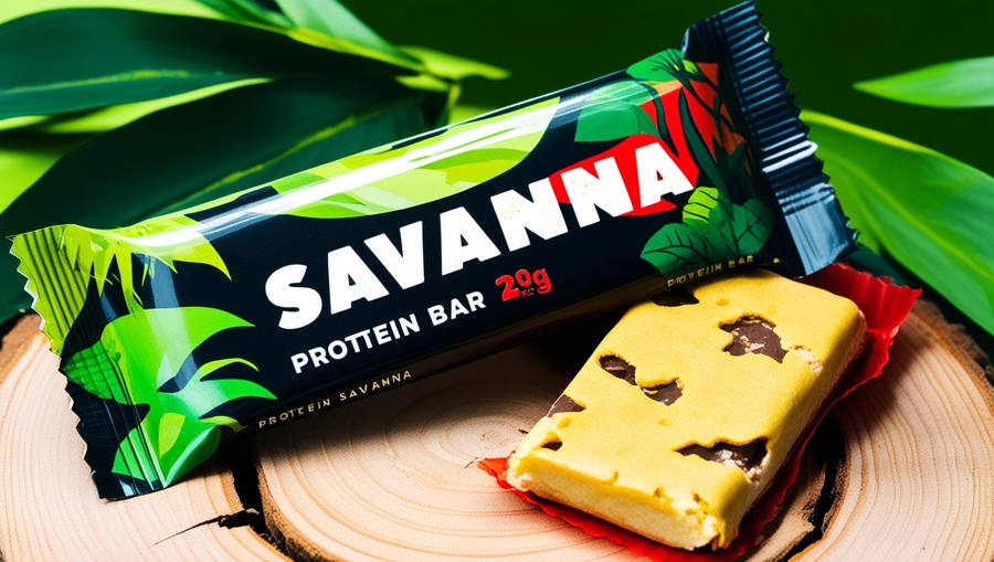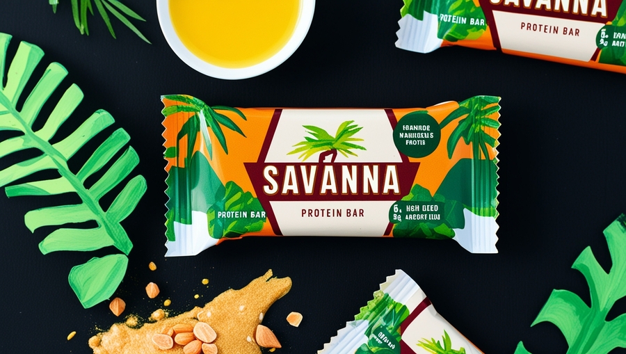 Промт: protein bar «Savanna» with jungle prints (and black packaging). В качестве референса стиля выступают оригинальные иллюстрации.