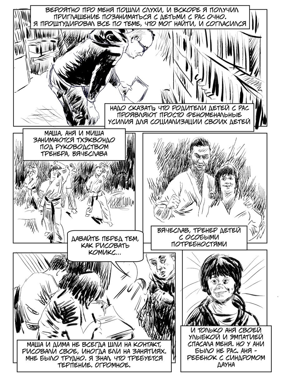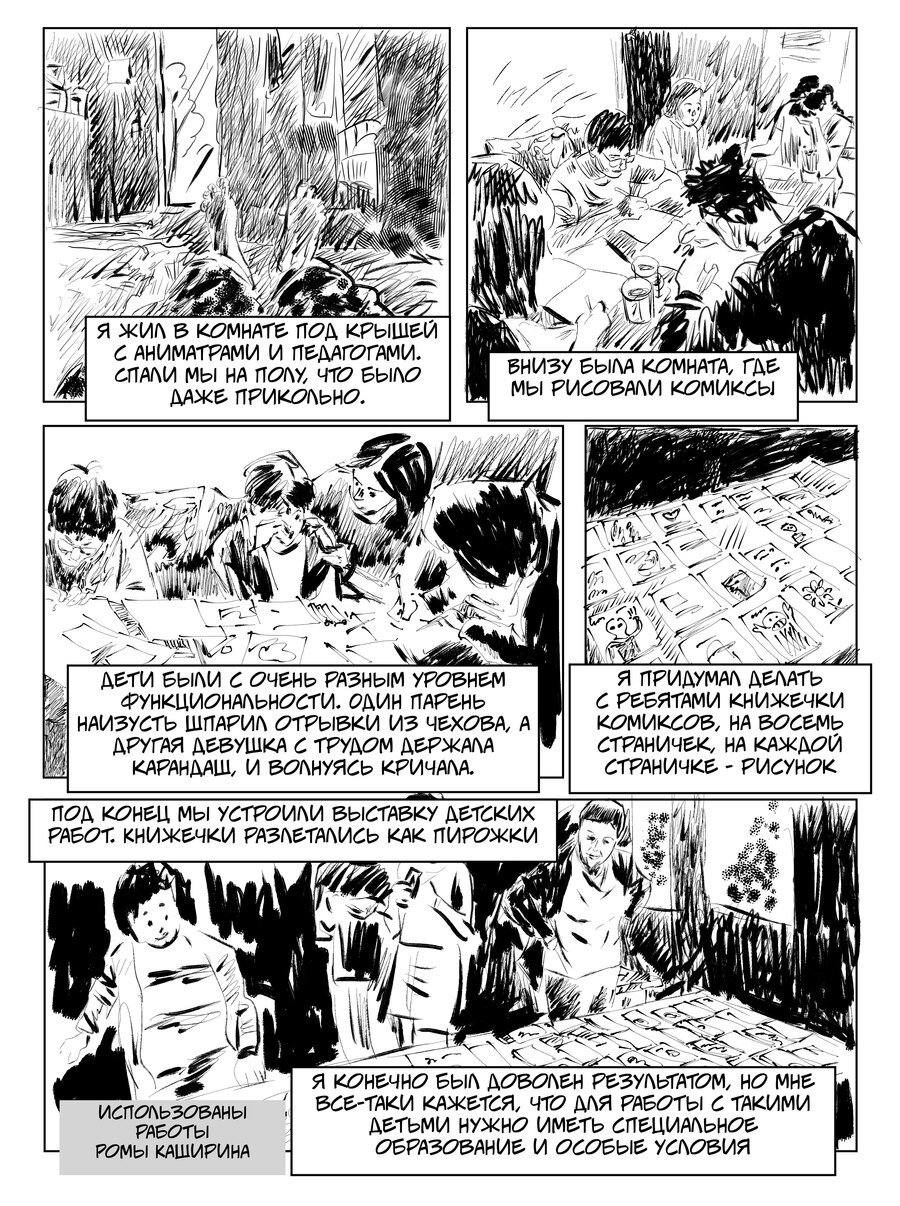 Также я короткое время преподавал комиксы в Алексинской воспитательной колонии для подростков. А позже был привлечен для преподавания визуальных историй для детей с синдромом расстройств аутистического спектра. Результатом этой работы стал короткий комикс «Такие дети», нарисованный по заказу журнала «Правила Жизни», для выпуска, посвященного российскому комиксу.