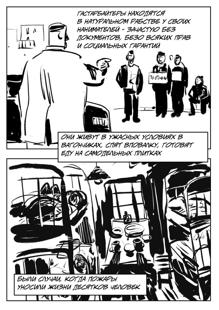 Для создания комикса я выбрал стилистику быстрого тушевого наброска кистью, которую сымитировал в графическом редакторе. Мне хотелось передать дух путевых заметок и драматизм социальной проблематики. Так появился первый социальный комикс-репортаж.