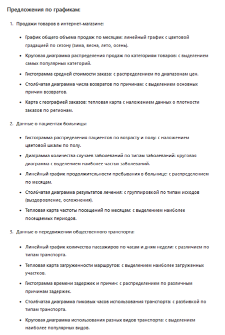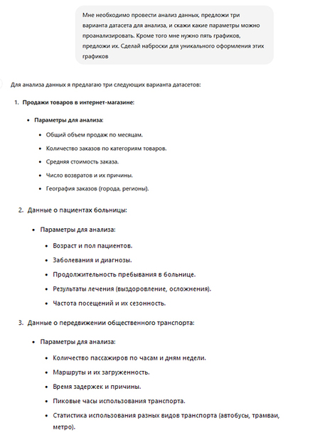 Нейросеть OpenAi Промпт: мне необходимо провести анализ данных, предложи три варианта датасета для анализа, и скажи какие параметры можно проанализировать. Кроме того мне нужно пять графиков, предложи их. Сделай наброски для уникального оформления этих графиков