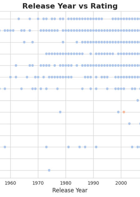 2. Диаграмма рассеяния показывает, что большинство фильмов и телешоу на Netflix были выпущены в последние годы, что соответствует стратегии компании по поддержанию актуального контента. Это также нам говорит о том, что платформа активно развивается и делает все, чтобы идти в ногу со временем.
