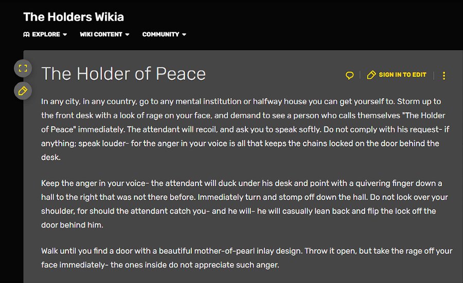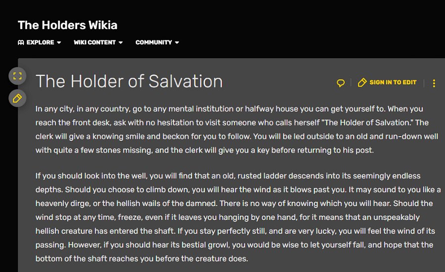 25 объект из 538. Значит, их множество. Позже станет известно, что ни в коем случае нельзя собрать все объекты вместе. Что произойдет — неизвестно, но уж точно ничего хорошего. Пользователи встретят публикацию с большим энтузиазмом и начнут писать свои истории, применимые к этой вселенной, то есть, описывать остальные из 538 объектов, создавать персонажей, включённых в её мир, добавлять новые правила. А назовут её The Holders.