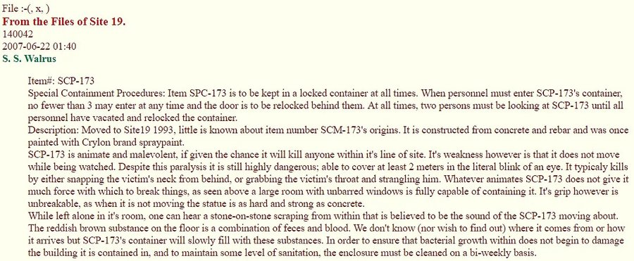 Итак, 22 июня 2007 года всё на том же 4chan аноним публикует странную статью о неком объекте SCP-173. Согласно статье, это жуткая статуя, которая двигается и грозит смертью тому, кто на неё не смотрит. Даже моргание может привести к летальному исходу любого, находящегося возле статуи. Статья написана сухим канцелярским языком и всем напоминает некий секретный документ, случайно просочившийся в Сеть: