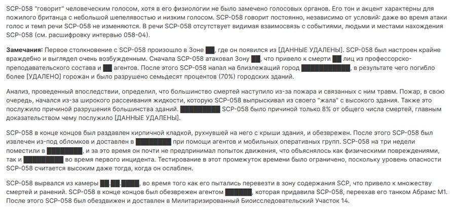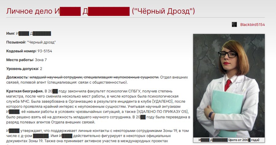 Личное дело И████ Д████████ («Чёрный Дрозд») / [Электронный ресурс] // SCP Foundation: [сайт]. — URL: https://scpfoundation.net/scp-058 (дата обращения: 21.05.2025).