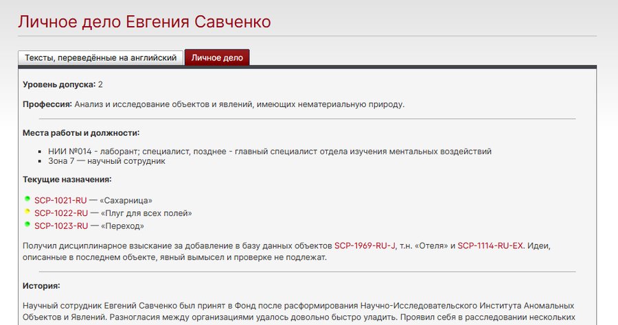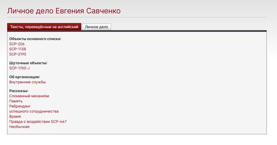 Личное дело Евгения Савченко / [Электронный ресурс] // SCP Foundation: [сайт]. — URL: https://scpfoundation.net/scp-058 (дата обращения: 21.05.2025).