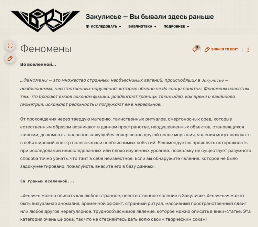 И вновь обитатели форума обрадовались и пошли формировать вселенную. И вновь методически: сначала посты в обсуждении форума, затем создание Wiki. Что интересно, сейчас нет официального сайта Закулисья, более того, есть несколько вики, посвящённых вселенной. Может быть, это связано с тем, что энтузиастов пока недостаточно, может, с тем, что, где-то с начала 2018 интернет стал более де-централизованным. В русскоязычном сообществе, несмотря на это, есть негласно «главный» сайт backroomswiki.ru. Пусть слово Wiki не вводит вас в заблуждение — формат, по сути, остаётся тем же энциклопедийным, но используется не платформа Wiki Fandom, на которой обосновываются многие другие вселенные с помощью конструктора собственной Wiki.