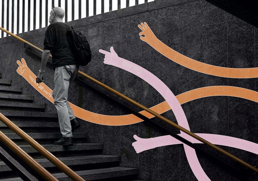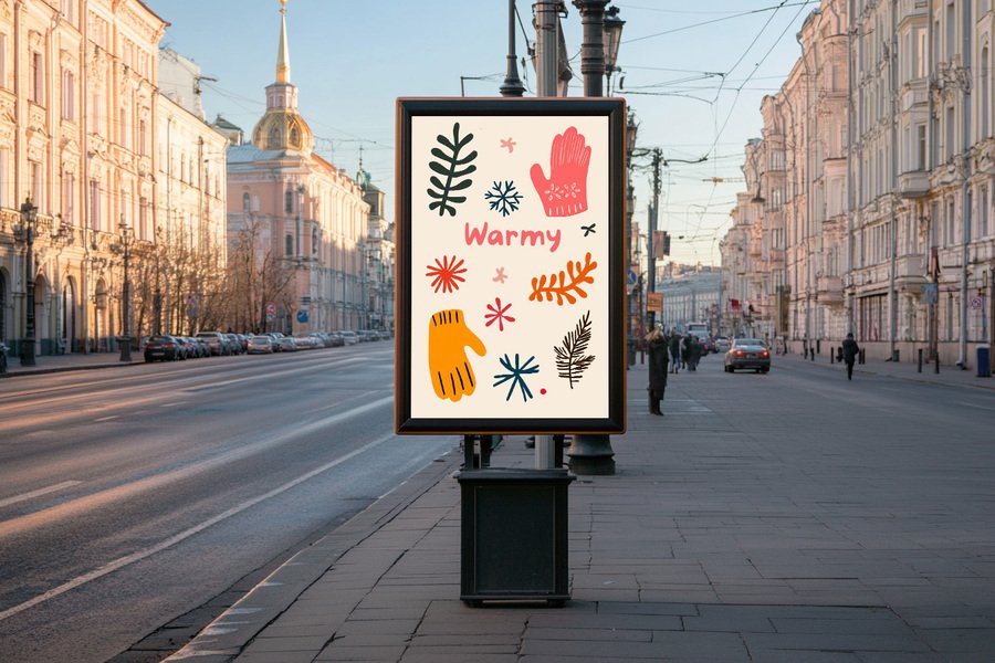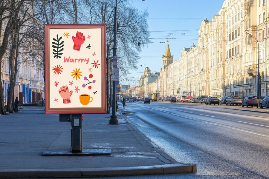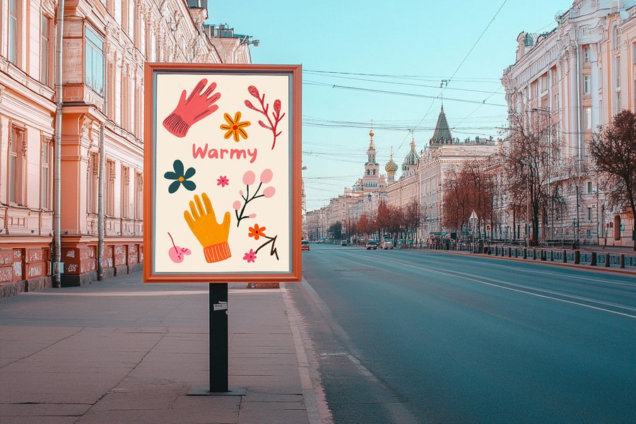 Промт биллборда: design of billboard poster 4600×9600 mm for brand of knitted mittens, color palette pink orange beige, hands in mittens, collage illustations of knitting ornament and simple shapes, background of the streets of Saint-Petersburg