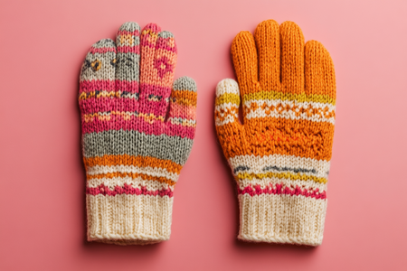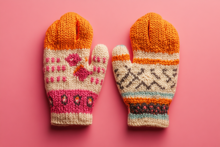 Промт: realistic image of knitted gloves, color palette pink orange beige, mittens with colourful ornament