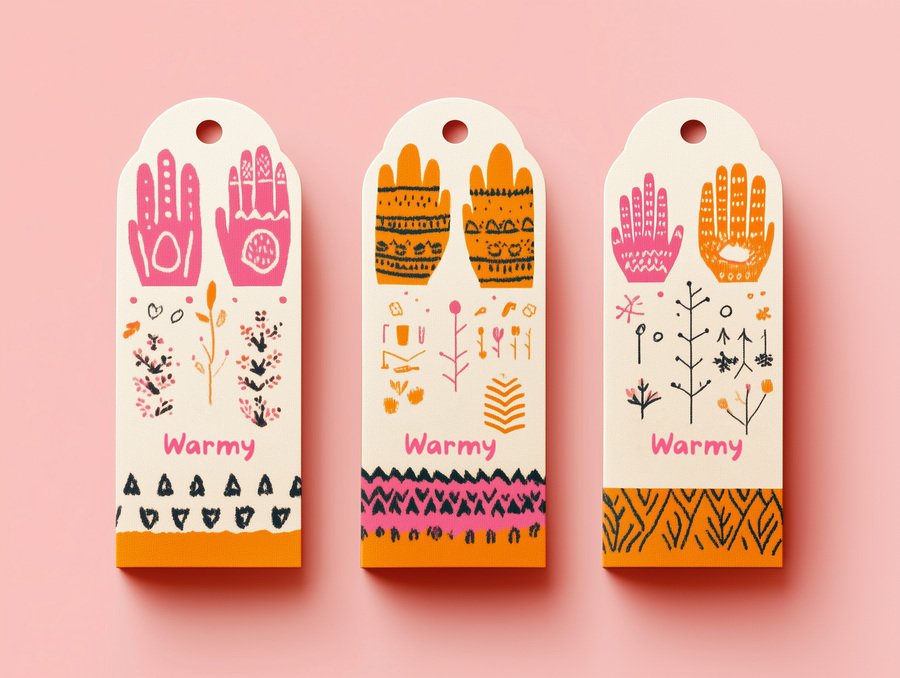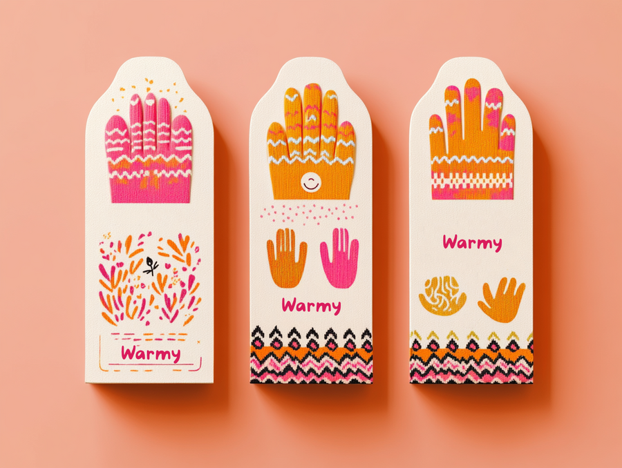 Промт упаковки: realistic image, product photography, cardboard packaging for brand of knitted mittens, color palette pink orange beige, bright colours, illustrations of hands in mittens and simple shapes on packaging, colourful design of packaging with illustrations