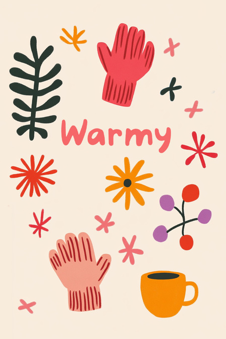 Промт к 1 постеру: poster for brand of knitted mittens, color palette pink orange beige, collage illustations of knitting ornament and simple shapes, hand in mitten, coffee cup
