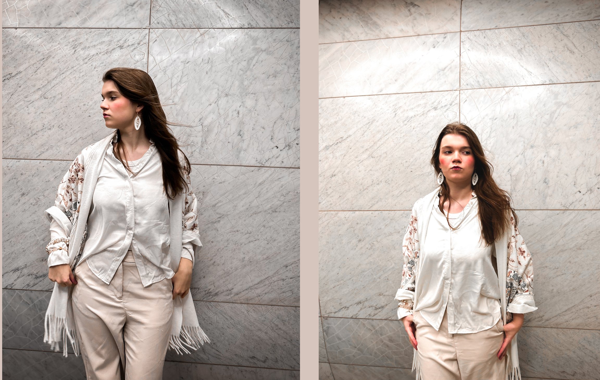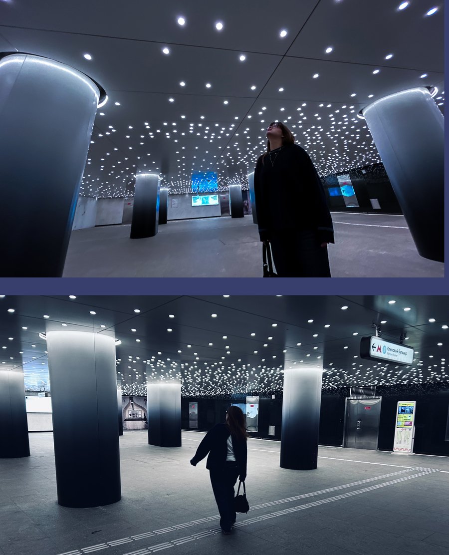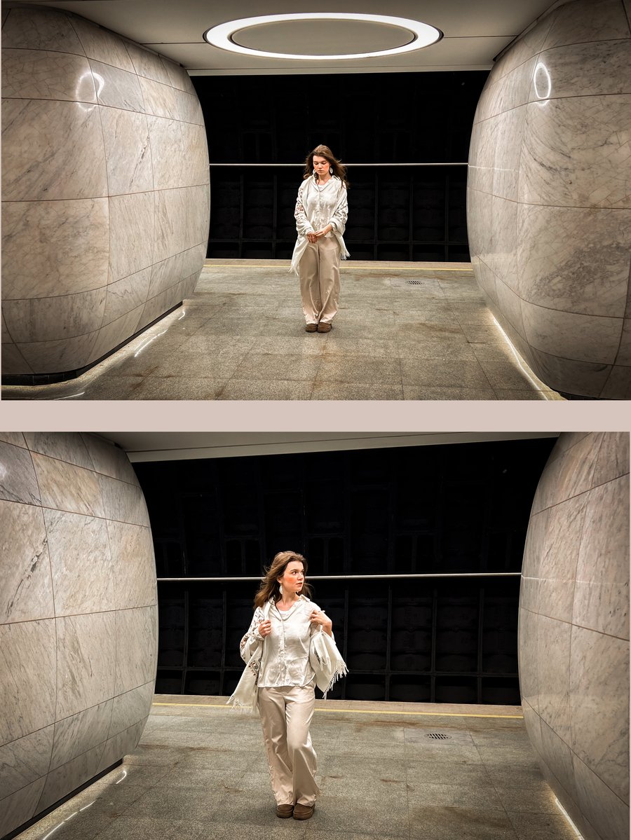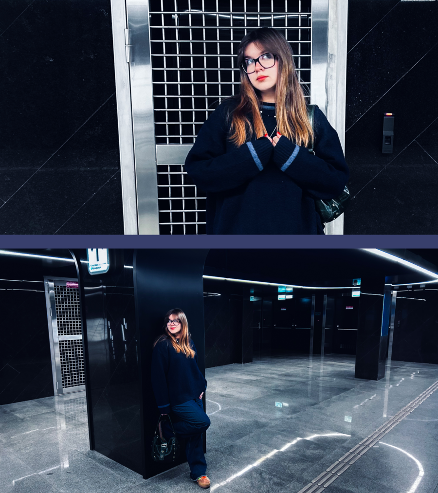 «Кленовый бульвар» выглядит как подземный космический центр, внутри которого создается весьма лирическое и меланхолическое настроение. Сочетание темного камня с контрастными источниками света формирует особую драматическую обстановку. Вестибюль станции украшен звездным небом, опирающимся на градиентные колонны. Находясь внутри этого пространства, мы словно погружаемся на глубину бездны. Модель транслирует в своем образе легкую томность и задумчивость, как в настроении, так и в одежде.